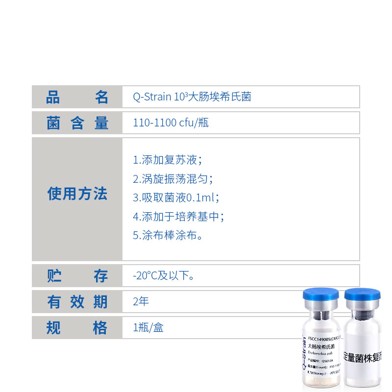 【产品用途】 大肠埃希氏菌定量质控菌株 QS011C适用于水及废水等相关水质微生物检测的质量控制,含菌量为 400-3000cfu/瓶。