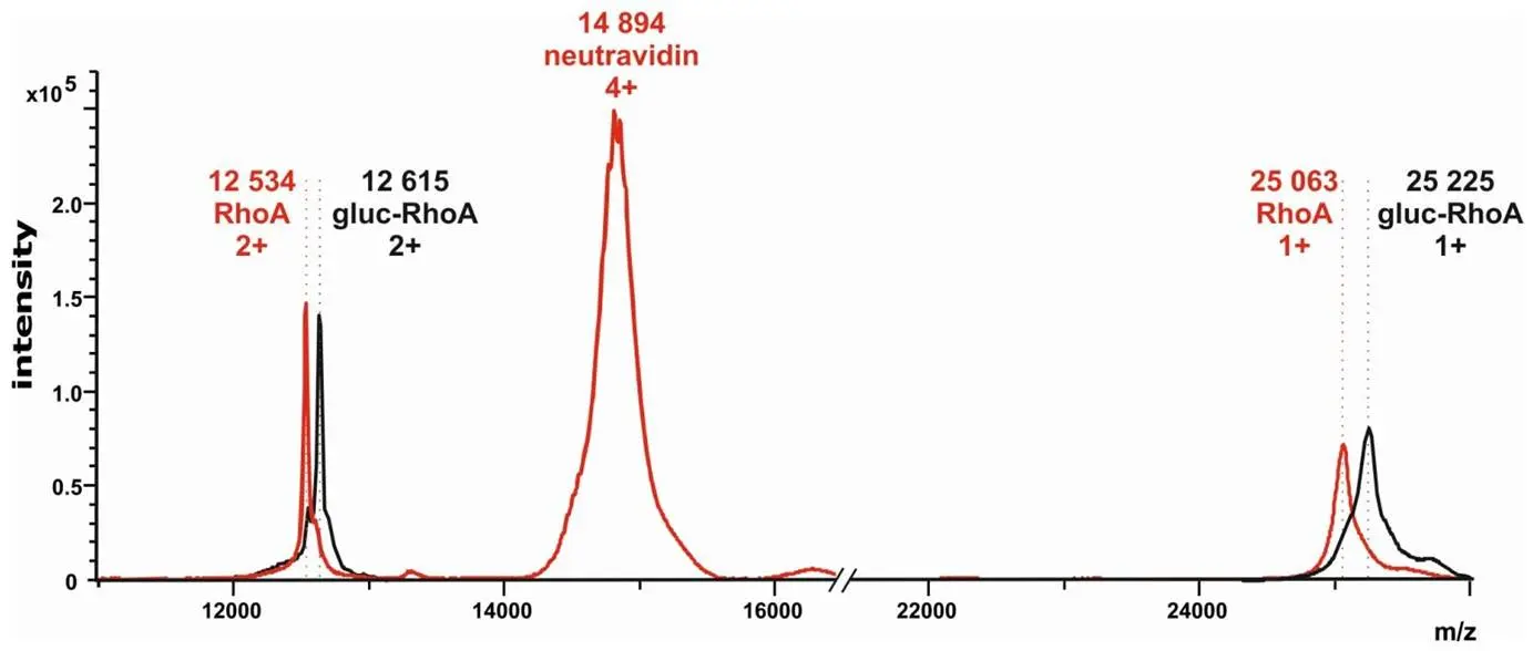 图 3:芯片上完整与糖基化 RhoA 的 MALDI - MS 光谱,体现毒素 B 作用。