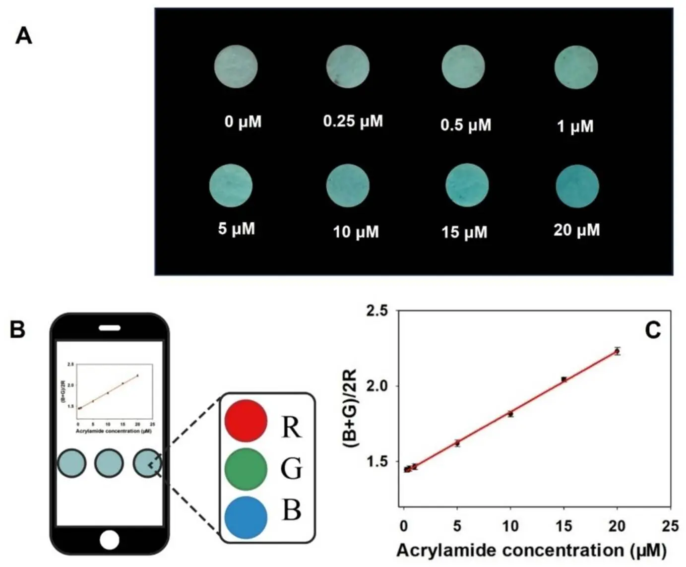 丙烯酰胺是国际癌症研究中心认定的 “2A 类致癌物”,常见于薯条、咖啡、面包等油炸、烘焙食品中,具有神经毒性、致癌性和致突变性。现有检测方法如酶联免疫吸附测定、质谱、电化学分析和气相色谱 - 质谱等存在仪器昂贵、操作复杂、预处理繁琐等问题,难以满足快速、低成本、超灵敏的检测需求,因此开发新型检测策略具有重要意义。
