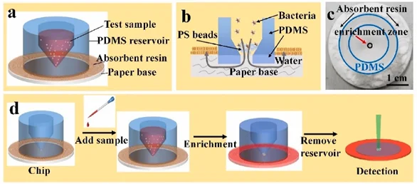 Figure 1 (a)三维微流控芯片整体结构;(b)芯片设计截面示意图;(c)制备芯片的光学显微图像;(d)基于该芯片的检测流程。